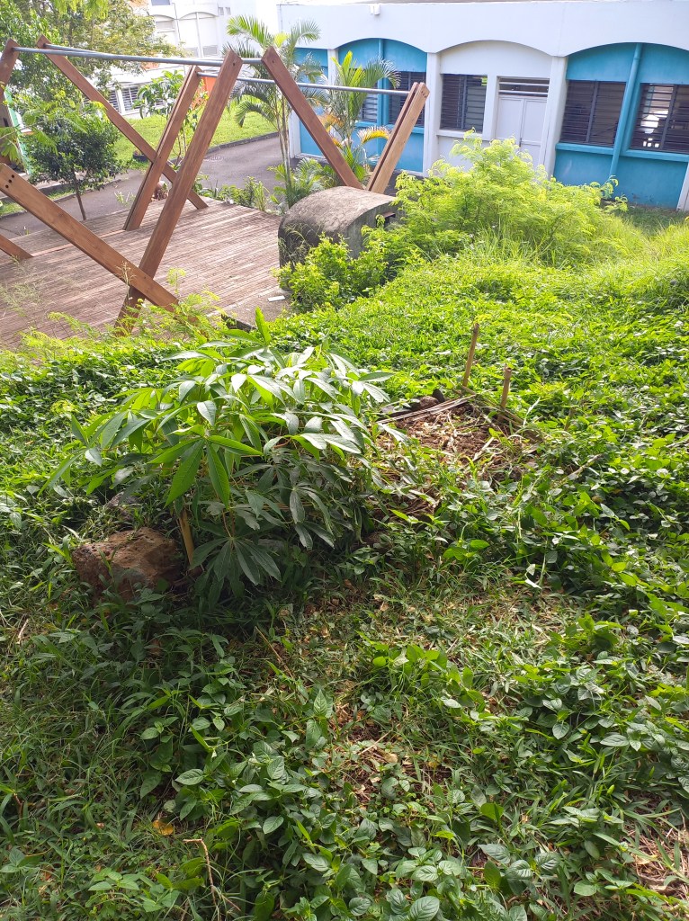 L’enjeu de la création de l’œuvre potagère est de faire découvrir aux participants, le patrimoine agricole de la Réunion, l’agronomie et la botanique par le biais d’une installation potagère en design permacole. L’œuvre est collective et participative. Les élèves créeront des sculptures géométriques, implantées dans le sol en bambou et bois de goyavier tressés en tournées de cailloux trouvés dans le sol, qui accueilleront les végétaux qui seront cultivés. La participation à l’œuvre peut être multiple, dons de végétaux comestibles, de semences, de terre ou de fumier, partage de savoir-faire et de compétences techniques. Les parents, le personnel de l’établissement et les enseignants qui le désirent pourront participer à la réalisation de l’œuvre. Les personnes ayant participé aux projets se partageront la production du potager.