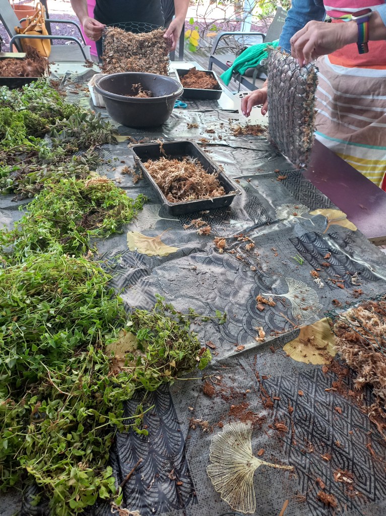 - Déroulement de la séance : Les participants recevront chacun un morceau de grillage qu’ils devront fermer latéralement avec du fil de fer pour le remplir de substrat. Ensuite, ils placeront un plastique de récupération à l’arrière de la cage et la rempliront de sphaigne et de paille de coco. Enfin, ils fermeront la cage pleine de substrat et composeront le tableau avec les végétaux proposés, en fonction du climat de la zone d’exposition du tableau.