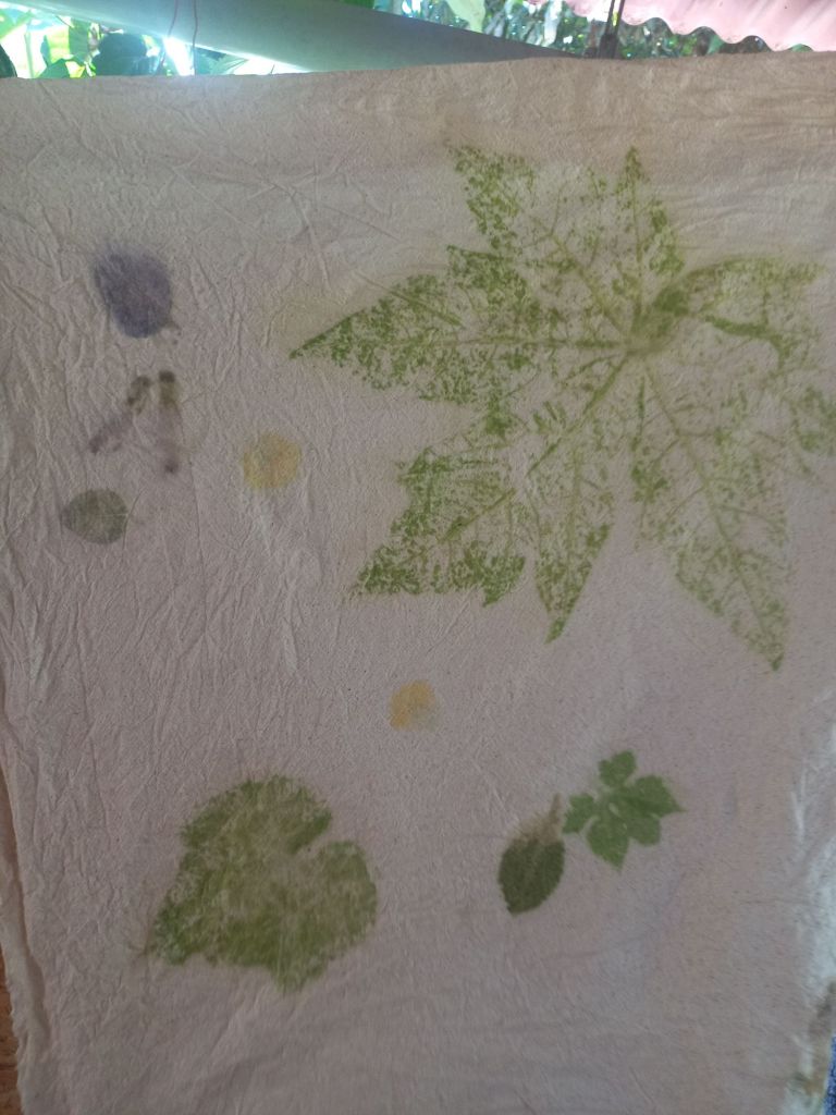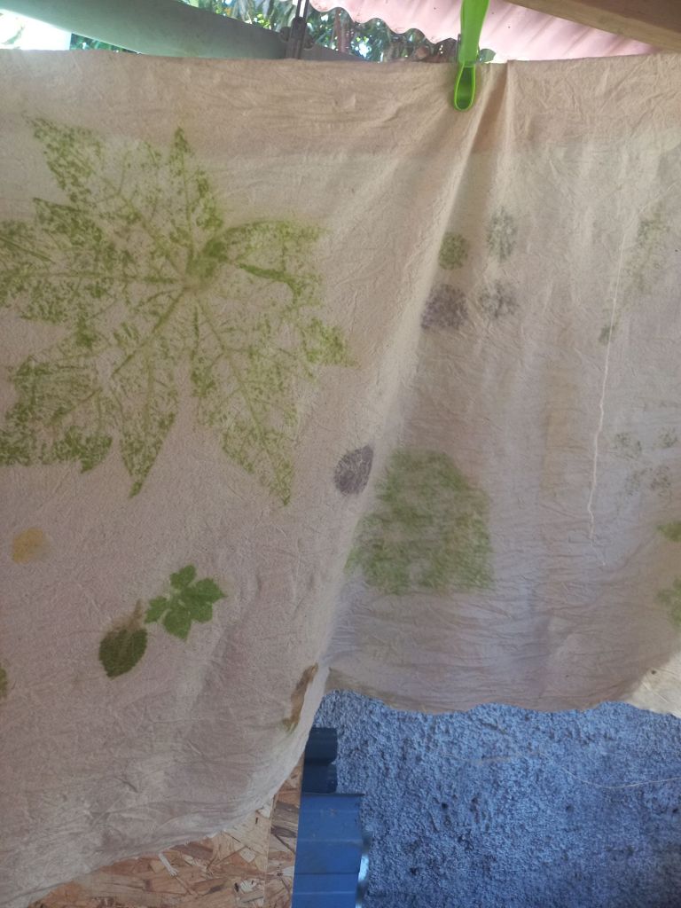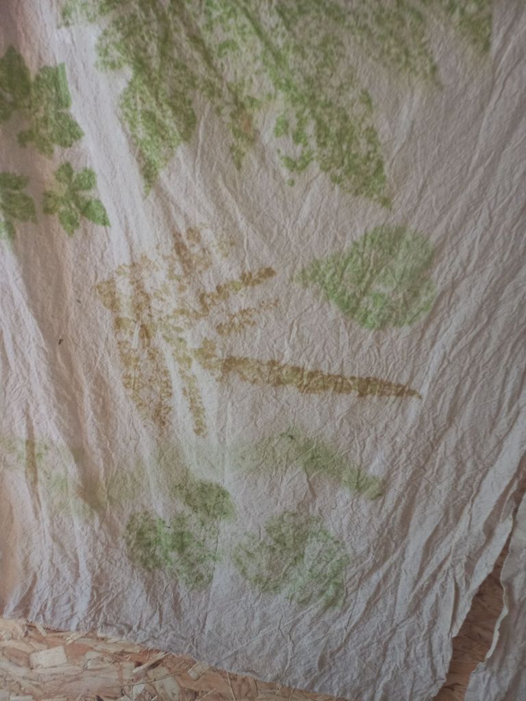 En suite, les végétaux collectés sont placés sur le tissu ,pour composer un mandala d’empreintes végétales. La composition obtenu est recouverte, d’un autre tissu. Les deux tissus sont épinglés en ensemble et frappée avec un mallet pour imprimer les végétaux .